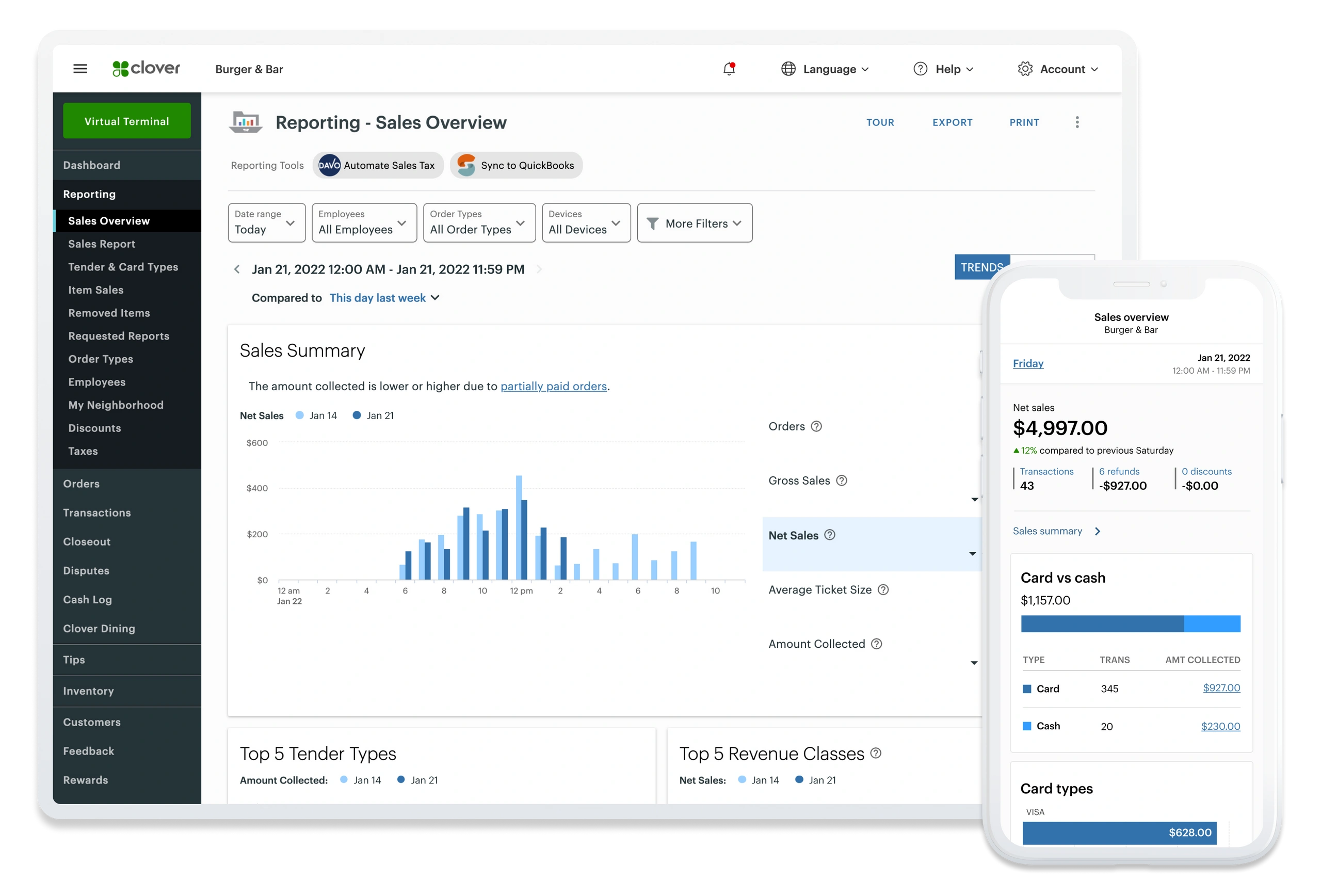 Use Clover’s powerful analytics tools to gain real-time insights into the sales trends and data that are driving your business, and track key metrics like revenue and performance.